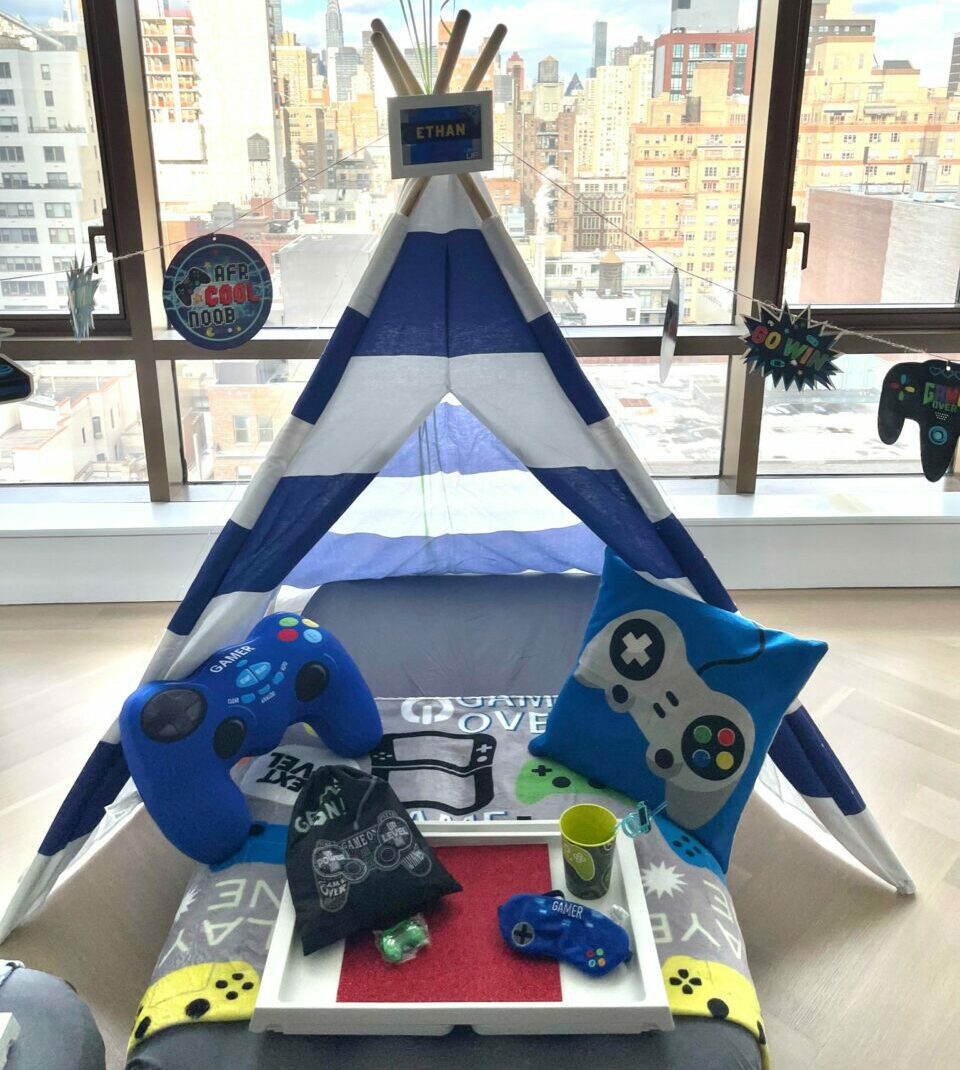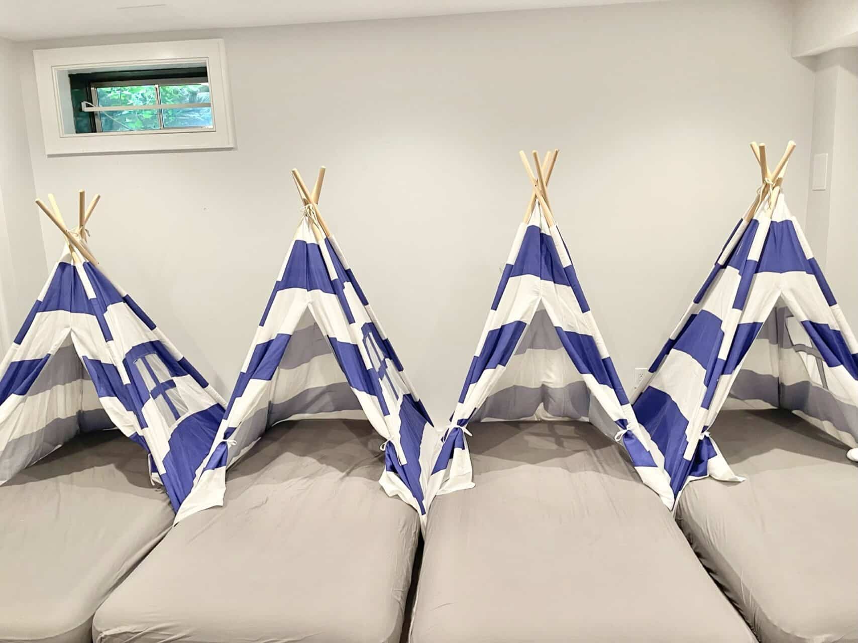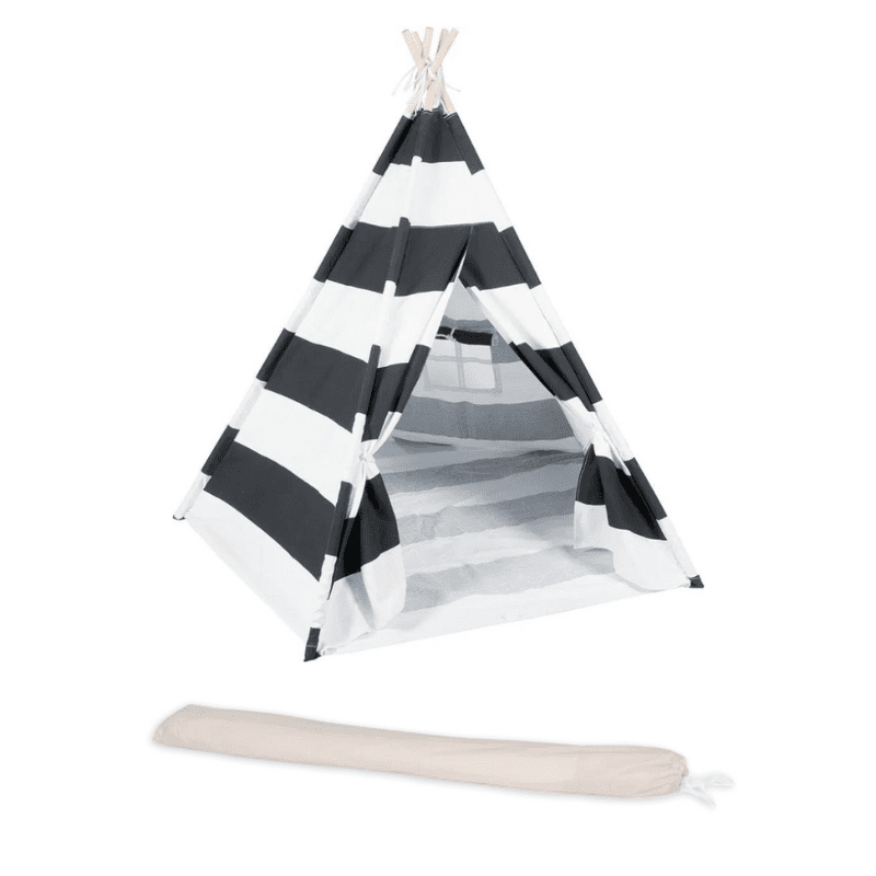 Navy-White Striped Cotton Canvas Teepee indoor or outdoor tent with wood poles and matching drawstring carry bag for easy storage or transport. Create a fun personal space for reading and hours of imaginative play. Perfect tent for sleepovers, glamping or slumber parties. This tent is also a great addition to your child’s bedroom or playroom and is easily collapsible for quick storage. The tent features a tie back front closure, a lookout window, and a roomy interior space ideal for playtime. Constructed from durable and washable canvas cotton material with sturdy wood poles, it easily sets up in minutes.