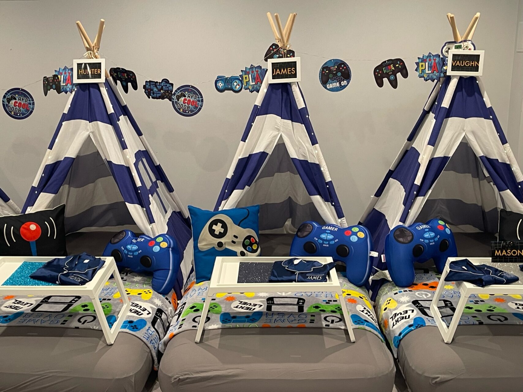 Each package includes: Navy-White Striped Teepee Sleepover Tent with Canvas Carry Bag.
