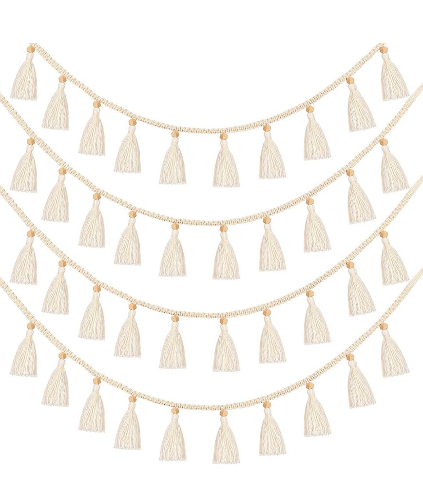 Macramé woven hanging fringe tassel garland perfect for bohemian home décor, nursery décor and sleepover parties etc. Each macramé woven tassel is made of cotton and beads, durable and reusable. Macramé woven tassel garland is made of pure cotton cord without any harmful materials. Ideal to hang on walls, crib side, woven basket, glass vases, lamps and more.