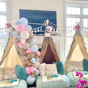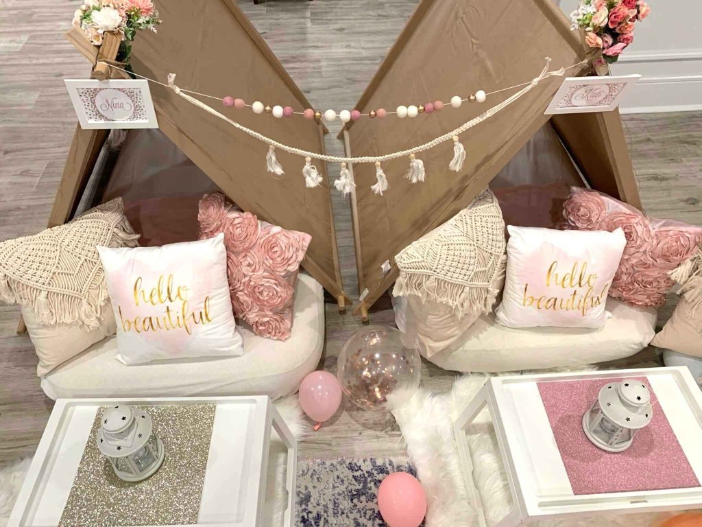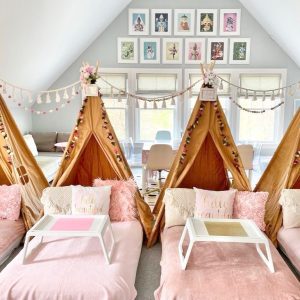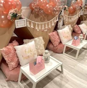 Signature Bohemian Elements: The Bohemian Romance theme is loved due to its soft color palette and cozy decor elements. To help you plan additional decor for your sleepover, here are suggested items like balloons, party favors, cups and plates. We try to make it easy for parents and clients to plan a sleepover.