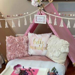 Our Bohemian Romance party theme can be customized with various tent color options and decor add ons. You can pick the combination that looks the best in your chosen space. If you are local to the NJ, NYC and Tri State Area, you can rent the tents and decor for an unforgettable sleepover. If you are based out of our service area and wanna Do It Yourself, you can purchase our tents and sleepover sets to create an experience based on your party vision.